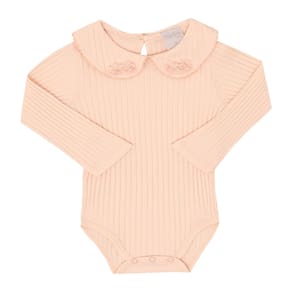 Body manga longa com babados aplicados de flores na gola, charmoso e quentinho para deixar sua pequena fashionista ainda mais charmosa. Confeccionado na cor rosa pó, possuí abertura entre as pernas com botõe de pressão para facilitar as trocas e o dia a dia das mamães.\n