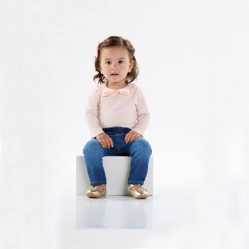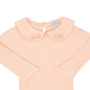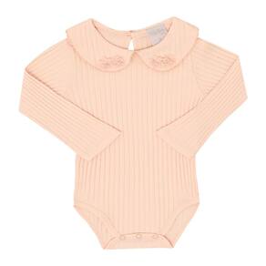 Body manga longa com babados aplicados de flores na gola, charmoso e quentinho para deixar sua pequena fashionista ainda mais charmosa. Confeccionado na cor rosa pó, possuí abertura entre as pernas com botõe de pressão para facilitar as trocas e o dia a dia das mamães.\n