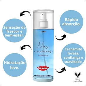 Body Splash Carmed nas Nuvens Cimed 200mln Body Splash Carmed Nas Nuvens 200mlO Body Splash Carmed Nas Nuvens é perfeito para quem busca leveza e sofisticação no dia a dia. Com uma combinação irresistível de âmbar, maçã verde e algodão-doce, essa fragrância traz um toque fresco e adocicado, deixando sua pele suavemente perfumada e hidratada.Seu aroma transmite suavidade e confiança, como se você estivesse flutuando em nuvens macias e pronta para conquistar o mundo..Benefícios:- Fragrância única e envolvente com notas de maçã verde, âmbar e algodão-doce- Sensação de frescor e bem-estar ao longo do dia- Hidratação leve para a pele, graças ao pantenol e ao pidolato de sódio- Textura suave e rápida absorção, ideal para qualquer ocasião- Fácil de reaplicar, deixando você sempre perfumada e renovada.Modo de Uso:1. Borrife o Body Splash Carmed Nas Nuvens diretamente sobre a pele.2. Aplique nas áreas de maior circulação, como pulsos, pescoço e atrás das orelhas, para uma fixação prolongada.3. Pulverize a uma distância de 15 a 20 cm da pele.4. Reaplique sempre que desejar renovar a fragrância..O produto hidrata a peleSim Ele contém pantenol e pidolato de sódio, que ajudam a manter a pele hidratada e perfumada ao mesmo tempo.Quanto tempo dura a fragrância na peleA fixação pode variar de acordo com a pele, mas costuma durar várias horas. Para prolongar o aroma, aplique em áreas estratégicas como pulsos e pescoço e reaplique ao longo do dia.Pode ser em qualquer tipo de peleSim, o Body Splash Carmed Nas Nuvens foi formulado para ser em todos os tipos de pele.Posso aplicar o body splash nas roupasO ideal é aplicar diretamente na pele, mas se desejar usar nas roupas, faça um teste em uma área discreta para evitar manchas. Marca: Não Informado