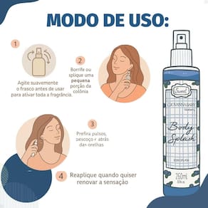 Modo de uso: Borrife o Body Splash Giovanna Baby Blueberry diretamente sobre a pele sempre que desejar. Pode ser aplicado após o banho, ao longo do dia ou antes de dormir, para garantir frescor, leveza e bem-estar prolongados.