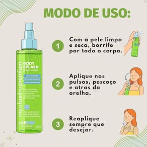 Modo de Uso/AplicaçãoAplique o Body Splash Meu Banho Premium Green Breeze em todo o corpo utilizando o método de spray.
