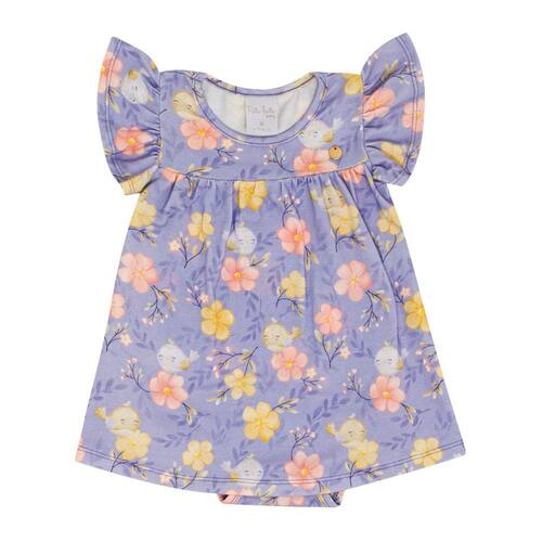 Para uma passeio no parque ou para um momento especial! Com o body vestido todas as possíbilidades são viáveis para os dias mais fresquinhos. Confeccionado em tecido cotton leve na cor lavanda com estampa de flores coloridas que são a cara da estação. Possuí abertura de botões entre as pernas facilitando troca para as mamães.