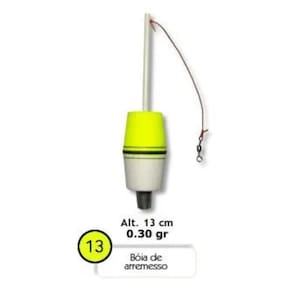 Especificações do Produto: Marca: Boias Barão Modelo: Boia de Arremesso 30 g Comprimento aproximado: 13 cm Peso: 30 g Cores disponíveis: Variadas Indicado para: Pesqueiros e lagos Uso: Arremessos longos; ideal para grandes peixes Marca: Não Informado Ean: 7794430970769