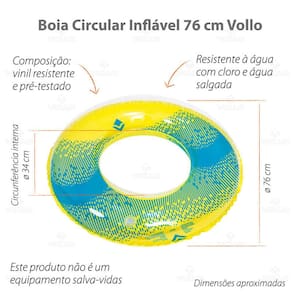 Boia Circular Inflável 76cm Vollo PiscinaCom a Boia Circular Inflável 76 cm Vollo, nadar e brincar na água fica muito mais divertido e seguro!Indicada para crianças e adultos que desejam relaxar e flutuar na piscina. A boia é leve e possui ranhuras em relevo para melhor aderência, tornando os dias quentes de sol e calor nas águas uma diversão absoluta!- Composição: Vinil resistente e pré-testado- Este produto não é um equipamento salva-vidas- Resistente à água com cloro e água salgadaADQUIRA JÁ A SUA!