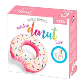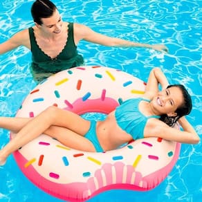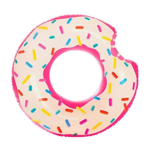Esta boia tem um incrível desenho em forma de donut, a base é cor-de-rosa e a parte superior imita um donut com decoração colorida em 3D. Para além disso, leva uma simulação de mordisco, parece um donut de morango de verdade! É resistente à água salgada e ao cloro, pelo que o poderá utilizar tanto na praia como na piscina. Esta boia mede 94x23 cm e não está recomendada para menores de 14 anos. É perfeito para desfrutar em família. Não terá nenhum , mas se sofrer de algum furo ou punção, o donut da Intex inclui remendos.