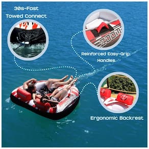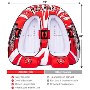 TUBO REBOCÁVEL MAIS O assento inovador do cockpit da Zoombros com design ergonômico do encosto aumenta a segurança e a estabilidade. Você não deve se preocupar em ser lançado. É para crianças e adultos que desejam uma pilotagem segura e confortável. CONSTRUÇÃO EXTRA ROBUSTA Este tubo divertido para a família possui quatro alças de espuma antiderrapante e totalmente coberta em nylon forte de 840 denier em torno de uma bexiga de PVC resistente. A capa de nylon com costura dupla pode lidar com desgaste sério. A drenagem inferior pode impedir que o tubo do barco submerja e arraste lentamente. SISTEMA DE REBOQUE ULTRA RÁPIDO O conector de reboque dianteiro para serviço pesado leva apenas 30 segundos para se conectar ao cabo de reboque. Possui válvula de segurança de velocidade para inflação e deflação rápidas e fáceis, deixa seu tubo rebocável pronto em pouco tempo Este tubo de água é compatível com bombas únicas no Marca: Não Informado