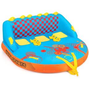 Tamanho maior com capacidade para 3 pessoas: Este tubo rebocável possui uma excelente capacidade de peso de até 300 kg, permitindo que até 3 passageiros se divirtam simultaneamente. O encosto extra alto e o assento amplo aumentam a estabilidade e o equilíbrio, garantindo maior segurança. Além disso, pode ser utilizado tanto por adultos quanto por jovens, proporcionando diversão para toda a família.