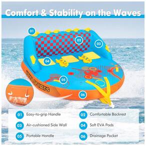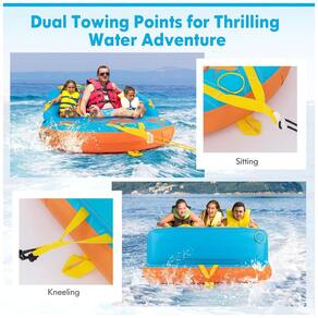 Conexão rápida e confortável: O tubo é projetado com pontos de reboque duplos, permitindo uma fixação rápida e segura ao barco. As alças acolchoadas em EPE, além de serem antiderrapantes, proporcionam maior conforto, especialmente em altas velocidades. Os usuários podem sentar-se, descansar nas almofadas de EVA ou se ajoelhar na direção oposta para aproveitar o máximo de velocidade e diversão.