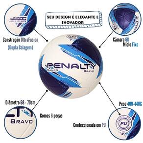 Alguns diferenciais técnicos: A Bola de Futebol de Campo Penalty Bravo possui construção Ultra Fusion, que garante menor absorção de água, garantindo desempenho consistente em qualquer condição climática. A tecnologia Ultra Fusion garante união termofundida dos gomos, oferecendo maior resistência e durabilidade. Além da Câmara 6D que dá equilíbrio total e trajetória precisa. Essa tecnologia, com 6 discos posicionados simetricamente, proporciona estabilidade e controle da bola durante os passes e chutes. Essa Bola de Futebol de Campo possui Dupla Colagem que reforça a junção dos gomos, aumentando a vida útil da bola e garantindo sua performance por muito mais tempo.