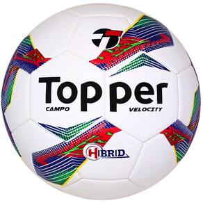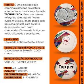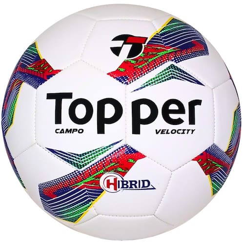 Marca: Topper Peso: 410 - 440 gr Gomos: 32 Gomos Circunferência: 68 - 69 cm Calibragem: 8 - 10 Libras Modelo: Velocity Hibrid Indicação: Campo de futebol ou treino Costura: Costurada Material da câmara: Câmara da Butil Toque: Macio e resistente Cor: Branca, com detalhes gráficos multicoloridos (azul, vermelho, verde, amarelo e preto) Tamanho: Oficial