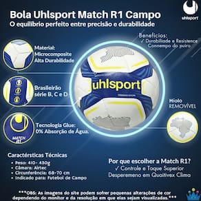 A Bola de futebol de campo MATCH R1 foi desenvolvida com uma câmara de látex injetada que oferece maior equilíbrio e melhor retenção de ar, forro com fios sintéticos para garantir maior durabilidade, oferece conforto em cada toque proporcionado por uma camada de EVA silicona com 5mm de espessura, o material externo feito com micro células sintéticas oferece muita durabilidade, o miolo é removível e todas as peças montadas com o sistema de termocolagem em dupla camada para perfeita junção das peças e 0% absorção de água.