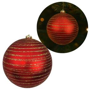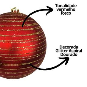 Destaque sua decoração com esta bola natalina grande de 15cm de diâmetro, perfeita para árvores maiores, arcos de festões e até fachadas. O acabamento em vermelho fosco com detalhe em espiral glitter dourado traz brilho e sofisticação para composições natalinas modernas ou tradicionais.