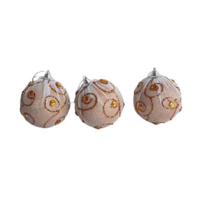 kit com 3 Bolas Decorativas de Natal na cor laranja com dourado, 10cm de diâmetro, estrutura em EPS revestida com renda, glitter dourado e pedras artificiais laranja.