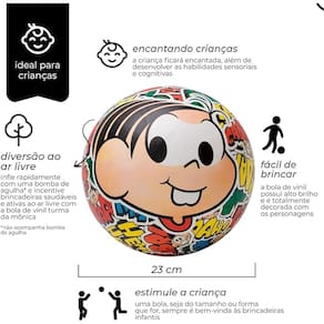 Brincadeiras saudáveis e ativas ao ar livre com a bola da Turma da Mônica Feito com material de qualidade, projetado para durar Evite bolas com pinos, pois eles podem asfixiar a criança! A bola de Vinil