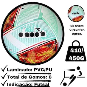 Especificações: Produto contém: 1 uma bola de futsal diadora veloce d11 oficial; Modelo: veloce d11 oficial; Marca: diadora; Indicação: partidas de futsal; Lançamento: 2022/23; Laminado: pvc; Total de gomos: 6; Construção: tech fusion; Câmera: especial; Peso aproximado: 410-450g; Circunferência aproximada: 62-64cm; Válvula: miolo removível/lubrificado; Acabamento: texturizado; Material da câmara: borracha.