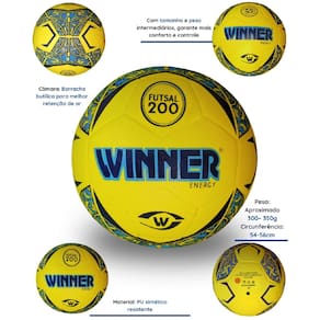 -Modelo: Winner Energy 200 -Indicação: Crianças de 9 a 11 anos -Peso: 300 – 350g -Circunferência: 54 – 56 cm -Material: Laminado sintético PU -Construção: Costurada à máquina -Câmara: Borracha butílica com boa retenção de ar -Tabela de Tamanhos – Bolas de Futsal Winner