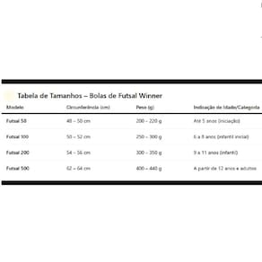 Modelo Circunferência (cm) Peso (g) Indicação de Idade/Categoria Futsal 50 48 – 50 cm 200 – 220 g Até 5 anos (iniciação) Futsal 100 50 – 52 cm 250 – 300 g 6 a 8 anos (infantil inicial) Futsal 200 54 – 56 cm 300 – 350 g 9 a 11 anos (infantil) Futsal 500 62 – 64 cm 400 – 440 g A partir de 12 anos e adultos.