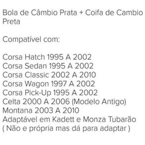 Corsa hatch 1995 a 2002 Corsa sedan 1995 a 2002 Corsa classic 2002 a 2010 Corsa wagon 1997 a 2002 Corsa pick-up 1995 a 2002 Celta 2000 a 2006 modelo antigo Montana 2003 a 2010 Adaptável em kadett e monza tubarão não e própria mas dá para adaptar