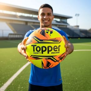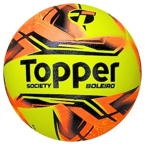 Características: - Marca: Topper - Modelo: Boleiro - Modalidade: Futebol Society - Material: PU/PVC resistente - Gomos: 6 Gomos - Peso: 410–440 g - Circunferência: 68–70 cm - Calibragem: 6-8 Libras - Tecnologia: TechFusion (sem costura) - Câmara interna: Borracha butílica (melhor retenção de ar) - Camada de Amortecimento: Emborrachada e Siliconada - Indicação de uso: Campos de grama sintética / society - Nível: Recreativo e amador