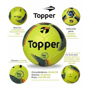 Características: Marca: Topper Modelo: Sintética Pro Costurada 2025 Indicação: Society Construção: Costurada Circunferência: 65 – 66 cm (oficial) Peso: 415 – 440g (oficial) Gomos: 32 Calibragem: 7 – 9 libras Câmara: Airvility Material: Laminado de alta performance (PU) Toque: Macio e preciso, garantindo maior conforto no domínio e nos chutes