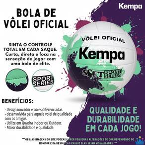 - Modalidade: Vôlei - Marca: Kempa - Linha: Soft Sports Series - Gomos: 18 - Material: Laminado Microcomposite - Construção: Costurada à mão - Câmara: Borracha Butílica - Sistema de Forro: Multiaxial - Miolo: Removível e substituível - Peso: 260 a 280g - Circunferência: 65 a 67 cm - Origem: Importada