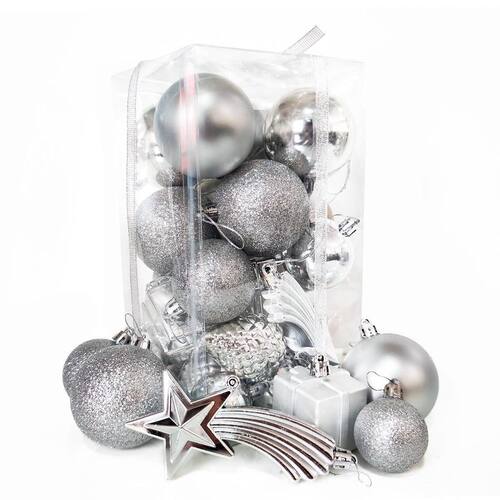 Este encantador conjunto de enfeites de árvore de Natal é composto por 26 peças variadas, perfeitas para adicionar um toque festivo e mágico à sua decoração natalina. Ele inclui bolas de Natal de três tamanhos diferentes, variando entre 4 e 6 cm de diâmetro. As bolas apresentam acabamentos variados: algumas têm um aspecto fosco elegante, outras são espelhadas para refletir luz e brilho, enquanto outras ainda são cobertas com glitter, garantindo um efeito cintilante que se destaca em meio aos outros enfeites. Além das tradicionais bolas, o conjunto também conta com miniaturas de presentes, pinhas e estrelas cadentes, todas elas projetadas com detalhes delicados para complementar o visual festivo da árvore. Cada item é feito de plástico durável e leve, o que garante maior resistência e praticidade, sendo seguro tanto para ambientes internos quanto externos. Todos os enfeites vêm com uma linha de pendurar, facilitando a montagem e permitindo que você distribua as peças uniformemente por toda a árvore. Este conjunto é perfeito para quem busca versatilidade e sofisticação em sua decoração natalina, trazendo elementos clássicos e brilhantes que vão iluminar o ambiente com o verdadeiro espírito de Natal. Marca: Klizz