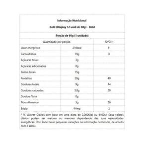 Bold Bar Display 12 unid de 60g - Sabor: Brownie e Crispies Bold Display 12 unid de 60g A Bold oferece barrinhas de proteína com um sabor irresistível, ideais para pequenas refeições ao longo do dia e para auxiliar na regulação do apetite. Elas proporcionam níveis sustentados de energia, abastecem o corpo com nutrientes de alta qualidade e promovem o desenvolvimento muscular. Com 20g de proteína, a Bold é uma opção saudável e saborosa, com uma composição balanceada de fibras, gorduras e carboidratos. Perfeita para todos os momentos vai muito bem como aquele lanche feito entre as principais refeições como pré e pós-treino ou, até mesmo como uma sobremesa extremamente saborosa e que não compromete a rotina alimentar. Experimente benefícios: - 20g de proteínas;- Zero adição de açúcares;- 5g de Fibras;- Perfil equilibrado de gorduras e carboidratos;- Baixa quantidade de sódio;- Saborosa, prática e fácil de consumir. Marca: Não Informado Ean: 7898755180152