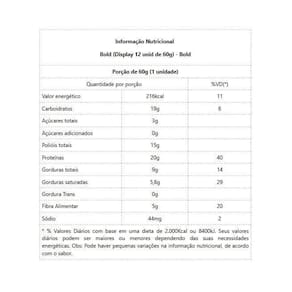 Bold Bar Display 12 unid de 60g - Sabor: Brownie e Crispies Bold Display 12 unid de 60g A Bold oferece barrinhas de proteína com um sabor irresistível, ideais para pequenas refeições ao longo do dia e para auxiliar na regulação do apetite. Elas proporcionam níveis sustentados de energia, abastecem o corpo com nutrientes de alta qualidade e promovem o desenvolvimento muscular. Com 20g de proteína, a Bold é uma opção saudável e saborosa, com uma composição balanceada de fibras, gorduras e carboidratos. Perfeita para todos os momentos vai muito bem como aquele lanche feito entre as principais refeições como pré e pós-treino ou, até mesmo como uma sobremesa extremamente saborosa e que não compromete a rotina alimentar. Experimente benefícios: - 20g de proteínas;- Zero adição de açúcares;- 5g de Fibras;- Perfil equilibrado de gorduras e carboidratos;- Baixa quantidade de sódio;- Saborosa, prática e fácil de consumir. Marca: Não Informado