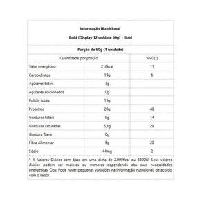 Bold Bar Display 12 unid de 60g - Sabor: Paçoca e Chocolate Bold Display 12 unid de 60g A Bold oferece barrinhas de proteína com um sabor irresistível, ideais para pequenas refeições ao longo do dia e para auxiliar na regulação do apetite. Elas proporcionam níveis sustentados de energia, abastecem o corpo com nutrientes de alta qualidade e promovem o desenvolvimento muscular. Com 20g de proteína, a Bold é uma opção saudável e saborosa, com uma composição balanceada de fibras, gorduras e carboidratos. Perfeita para todos os momentos vai muito bem como aquele lanche feito entre as principais refeições como pré e pós-treino ou, até mesmo como uma sobremesa extremamente saborosa e que não compromete a rotina alimentar. Experimente benefícios: - 20g de proteínas;- Zero adição de açúcares;- 5g de Fibras;- Perfil equilibrado de gorduras e carboidratos;- Baixa quantidade de sódio;- Saborosa, prática e fácil de consumir. Marca: Não Informado Ean: 7898755180190