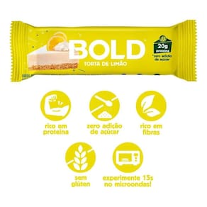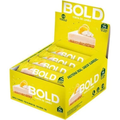 Bold Bar Novo Sabor Torta de Limão - Bold SnacksLançamento Bold Snacks Bar Torta de Limão Nova Fórmula, Mais Macia.Imagina uma barra de proteína sem adição açúcar, deliciosa, prática e nutritiva, que mais se parece com seus doces favoritos que satisfazem o seu desejo de doce sem sair da dieta. Imaginou? A nova BOLD é exatamente isso! Com mesmos 20g de proteínas, 5g de fibras, é ideal para praticantes de atividades físicas de todas as idades e modalidades esportivas, sendo uma ótima escolha para pequenos lanches e como parte de dietas com objetivo de aumentar a ingestão de proteínas. Experimente colocar a sua Bold bar no micro-ondas por alguns 15 segundos para ter uma experiência ainda melhor.A barra de proteína BOLD BAR é considerado por muitos como a melhor escolha, pois esta barra foi criada pensando em ser o melhor snack para seu dia a dia corrido.BOLD BAR é seu snack sem culpa!Ingredientes: Blend proteico proteína concentrada do leite, caseinato de cálcio, proteína concentrada do soro de leite , maltitol, ganache de chocolate branco, chocolate branco diet, gordura de palma, colágeno hidrolisado, polidextrose, crispie proteico, fibra de milho solúvel, glicerina bi destilada, aromatizante idêntico ao natural, emulsificante: lecitina de soja INS 322 , cloreto de sódio, conservantes: sorbato de potássio INS 202 e vitamina E.NÃO CONTÉM GLÚTEN. ALÉRGICOS: CONTÉM DERIVADOS DE LEITE E SOJA; PODE CONTER AMENDOIM, AVELÃ, CASTANHA DE CAJU, CASTANHA DO PARÁ E NOZES. CONTÉM LACTOSE. PESO LÍQUIDO: 60g com 20g Proteína Unidade QUANTIDADE: 12 unidades por caixaSugestão de consumo: consumir até 2 unidades ao dia ou conforme orientação do médico e/ou nutricionista.Conservação: Conservar este produto fechado em local fresco, seco e ao abrigo da luz. Após aberto consumir imediatamente.Validade média é de 6 meses ou superior.