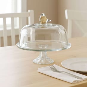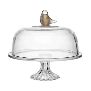 Seu design elegante com pé elevado valoriza bolos, tortas e sobremesas, enquanto a tampa de cristal com delicado detalhe de pássaro traz um charme especial à peça.