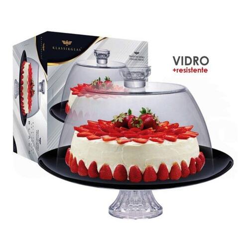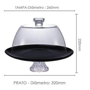 DESCRIÇÃO DO PRODUTO: - Dimensões: Altura: 33cm / Largura: 34cm / Comprimento: 32cm - Peso total do Produto: 3,4kg - Material: Vidro - Cor: Preto / Transparente - - Uso: Bolo / Torta - Garantia: 3 Meses de Fábrica - Conservação: Para conservar seu produto sempre utilize água e sabão neutro, não utilizar produtos abrasivos.