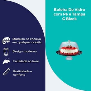 Exiba e sirva seus bolos, tortas e sobremesas com a Boleira Black. O prato em vidro na cor preta dá destaque aos alimentos e preparações. A tampa e o pé são fabricados também em vidro transparente o que permite a visualização e decoração de seus produtos.