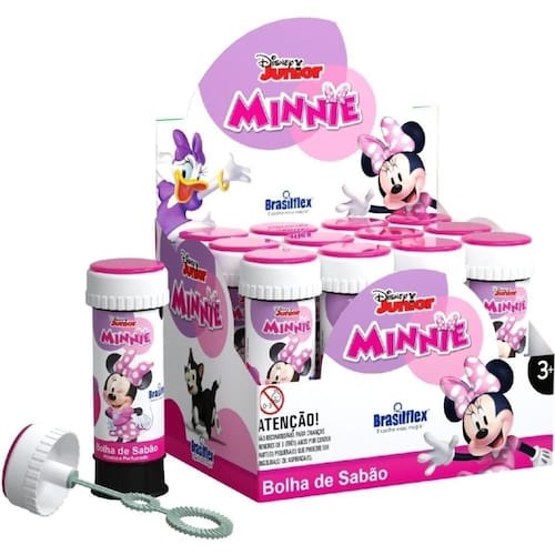 bolha de sabao minnie 60ml c/jogo unidade: cx. C/12 kit bolha de sabão minnie com 12 frascos de bolha de sabão c60ml. A tampa vem com um jogo de labirinto para a criança se divertir. Atóxica e perfumada. As cores do frasco e da tampa podem variar. Produto homologação inmetro: 0041/18-bq-01