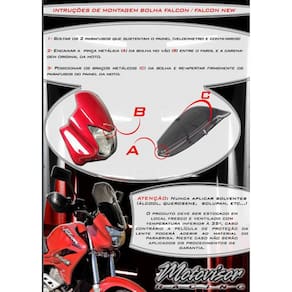 Funcionamento: Com design ultra-moderno, linhas aerodinâmicas e tamanho reduzido, esta carenagem bolha é a solução ideal para os usuários de FALCON que trafegam em rodovias ou vias públicas com velocidades acima de 60 km/h pois esta carenagem desvia grande parte do vento que incide sobre o motociclista tornando a pilotagem muito mais confortável.