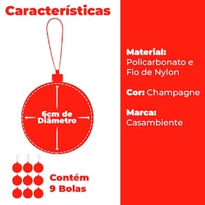 As bolas de Natal, com certeza são os enfeites mais conhecidos quando falamos de decoração natalina, por este motivo trazemos as Bolas de Natal Champagne e Prata 6cm 9 peças da Casambiente, fabricadas com 6cm de diâmetro e lisas, com glitter e foscas estas bolas são ideias para completar a decoração de sua árvore de Natal, criar um varal de bolinhas para pendurar ou para expor na sua varanda e sacada. Receba seus familiares e convidados com as Bolas de Natal Champagne e Prata 6cm 9 peças, impressionando todos com a beleza de sua decoração.