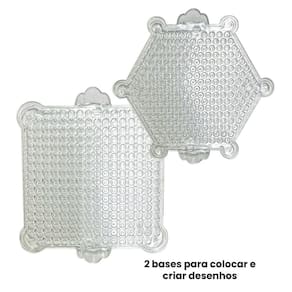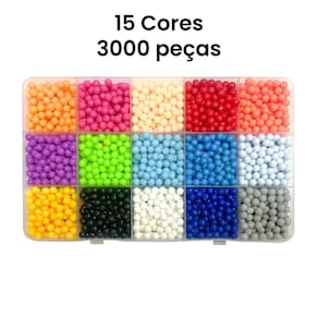 Estojo com aproximadamente 3000 bolinhas coloridas, diversos modelos de desenhos, gabarito para colocar as bolinhas, reservatório spray para água, espátula para remoção do sticky, pinça para manusear as bolinhas, entre outros acessórios.