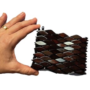 Bolsa confeccionada com pecinhas de madeira no formato de pequenos losângulos, pintados e envernizados, na cor marrom escura, com acabamento interno em cetim e fechamento com zíper.