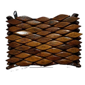 Bolsa confeccionada com pecinhas de madeira no formato de pequenos losângulos, pintados e envernizados, na cor marrom, com acabamento interno em cetim e fechamento com zíper.