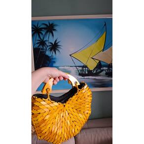 Bolsa confeccionada com pecinhas de madeira no formato de pequenos losângulos, pintados e envernizados, Amarela, com acabamento interno em cetim e fechamento com zíper. Alça CURTA de MADEIRA formato meia lua com 18 cm diâmetro. A bolsa é arredondada em formato de meia lua com profundidade de 6 cm.