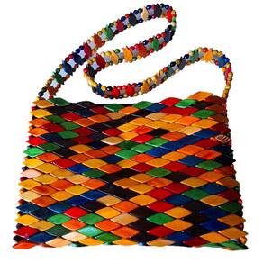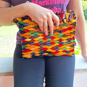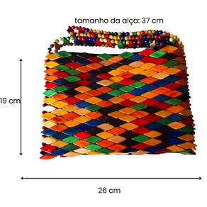 Bolsa confeccionada com pecinhas de madeira no formato de pequenos losângulos, pintados e envernizados, em diversas cores, com acabamento interno em cetim e fechamento com zíper. Alça MÉDIA feita do mesmo material medindo 37 cm.