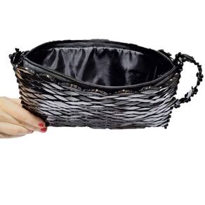 Bolsa Artesanal em Peças de Madeira Envernizada Preta, Alça Curta, com Zíper e interior em tecido cetim