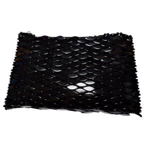 Bolsa confeccionada com pecinhas de madeira no formato de pequenos losângulos, pintados e envernizados, na cor Preta, com acabamento interno em cetim e fechamento com zíper. Alça Curta feita do mesmo material medindo 40 cm.