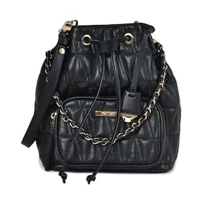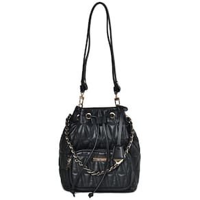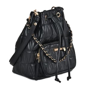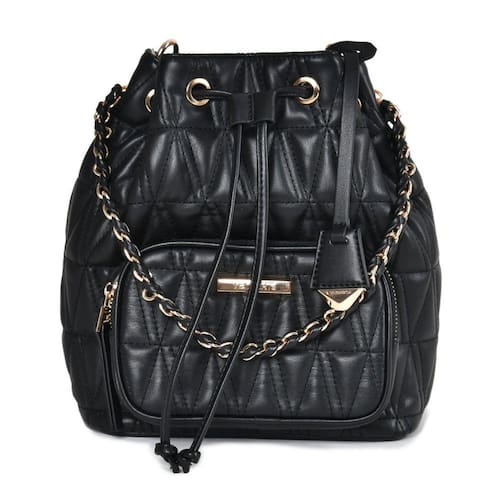Bolsa bucket feita em PU com matelassê geométrico. Possui alça com ajuste de altura, podendo ser usada como bolsa de ombro ou tiracoloco, sendo removível com mosquetão de metal personalizado e alça fixa de corrente trançada com PU. Possui bolso frontal com abertura de de zíper de metal. Abertura principal com cadarço de PU regulando a sua amarração. Peça forrada com bolso interno de zíper. Etiqueta patch na parte interna. Placa frontal Via Marte de metal retangular. Acompanha chaveiro personalizado.