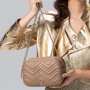 Bolsa Câmera Bag Matelassê Via Marte, confeccionada em PU com acabamento geométrico matelassê, combina praticidade e estilo. Possui alça tiracolo ajustável em PU com detalhe de corrente e fivela personalizada para ajuste de tamanho. O fechamento principal é feito com zíper de metal e puxador personalizado com detalhe de PU. O interior é forrado e conta com bolsos, incluindo um com zíper para melhor organização. A peça é finalizada com uma placa frontal redonda de metal da Via Marte, destacando a marca com elegância.