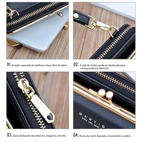 Essa bolsa carteira possui várias repartições para cartões, fechamento em zíper e também possui compartimento para celular com fechamento em pressão! Pode ser usada como bolsa lateral e transversal pois possui alça removível e ajustável.