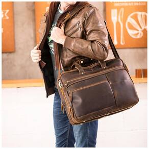 Feito à mão por artesãos – Feito com couro bovino italiano grosso de flor integral, equipado com ferragens robustas e zíperes YKK premium – Planeje ter isso nos próximos anos. Design de versão grande – O compartimento do laptop pode acomodar um laptop de 43 centímetros. Possui três compartimentos grandes e vários bolsos frontais e internos com zíper, ideais para todas as suas necessidades diárias. A alça de viagem na parte de trás da bolsa facilita muito a combinação da bagagem. Dimensões – 46(C) x 15(L) x 35(A) cm. Peso do item: 5 libras/2,3 kg. Ótimo para sua viagem de negócios – Use-o como pasta de negócios, mensageiro, bolsa de ombro e bolsa de viagem, prenda o estojo. Se você quiser sair de 2 a 3 dias e não quiser carregar uma mochila grande, esta bolsa seria uma boa escolha.