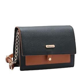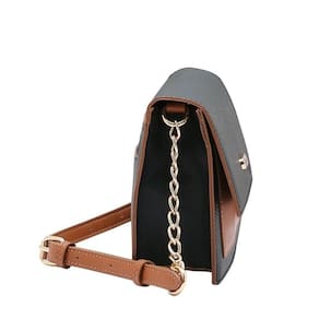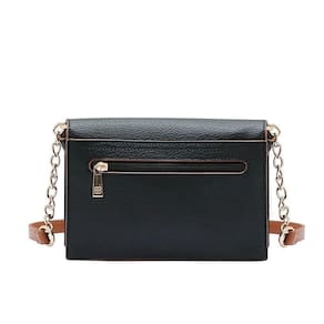 acabamento bicolor sofisticado e alça com detalhe de corrente dourada. Fechamento por aba com botão magnético, bolso interno com
