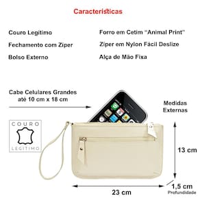 Bolsa clutch, carteira de mão e porta celular em COURO 100% autêntico, muito versátil e prática, possui 1 bolso externo fechado por zíper para pequenos objetos, todos os metais (argola, mosquetões, zíperes, etc) são na cor prata. O fechamento principal é feito com zíper em nylon de fácil deslize. Possui alça externa de mão, excelente para uso no dia a dia. Possui a medida ideal para levar pequenos objetos, carteiras pequenas, celulares de tamanhos médio e grande, etc.