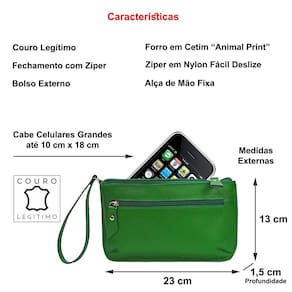 Bolsa clutch, carteira de mão e porta celular em COURO 100% autêntico, muito versátil e prática, possui 1 bolso externo fechado por zíper para pequenos objetos, todos os metais (argola, mosquetões, zíperes, etc) são na cor prata. O fechamento principal é feito com zíper em nylon de fácil deslize. Possui alça externa de mão, excelente para uso no dia a dia. Possui a medida ideal para levar pequenos objetos, carteiras pequenas, celulares de tamanhos médio e grande, etc.